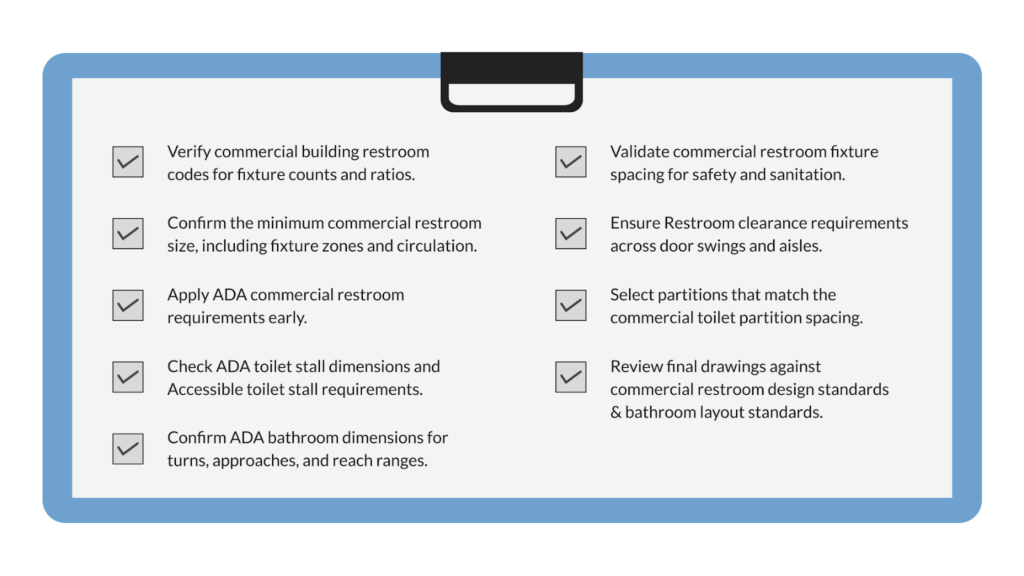 A final review against commercial bathroom code compliance reduces inspection risk and change orders.